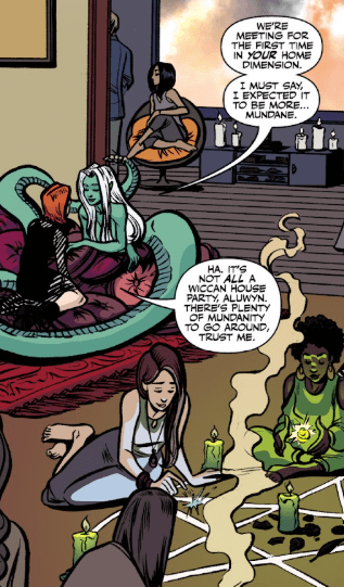 Aluwyn grins at her, seductively. “How could it be anything else?” And then she turns. They’re in a large house, downstairs in a living area. Witches are all around them, talking magic, learning spells, conjuring in corners. And the Saga Vasuki has her tail wrapped around Willow, on the couch. “We’re meeting for the first time in your home dimension.” She glances around at the room again. “I must say, I expected it to be more mundane.”