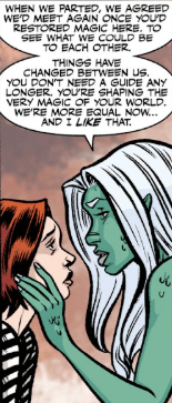 “What else is there to discuss?” the snake lady purrs at her. “You’re using your mystic book to shape Earth’s new rules of magic. I can’t imagine a better choice. I have also confirmed that the dimensional barrier between your world and the mystic realms are strong, from both sides.”