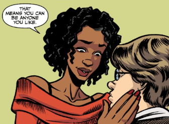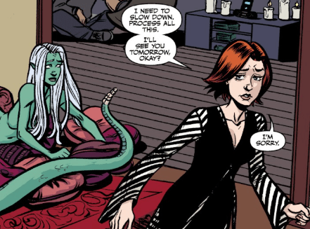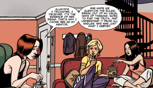 Elsewhere in the city, Willow is sitting opposite Aluwyn. They’re together, the student and Saga Vasuki. In this dimension. Willow stares into her lover’s eyes. “Okay. This is definitely a little weird.”