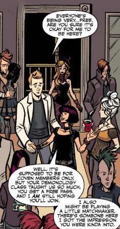 Julie turns to him, gesturing around. “Well, it’s supposed to be for coven members only, but your Demonology class taught us so much, you get a free pass. And,” she says pointedly, smiling at him. “I am still hoping you’ll join.” Then, with no explanation, she smirks at her friend. “I also might be playing a little matchmaker. There’s someone here I got the impression you were kinda into.”