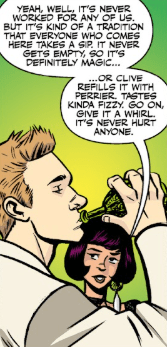 “Yeah, well, it’s never worked for any of us. But it’s kind of a tradition that everyone who comes here takes a sip. It never gets empty, so it’s definitely magic.” As she watches, Andrew takes the glass top from the old antiquated bottle and knocks back a large gulp. Julie then chimes in. “Or maybe Clive refills it with Perrier. Tastes kinda fizzy. It’s never hurt anyone.”