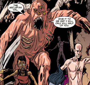 People are screaming. Running. A large glob like demon, with extra human appendages emerges from the darkness, surrounded by decaying flesh monsters that barely walk upright. “The Asclepian vial,” he roars. “Give it to me and I, the Sculptor, will only kill half of you!”