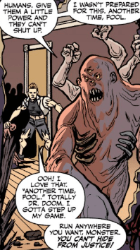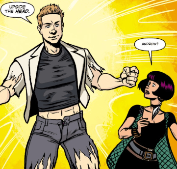 Andrew grins as the demon leaves, yelling after him. “I love that: ‘Another time, fool!’ Totally Doctor Doom! I gotta step up my game. Run anywhere you want, monster. YOU CAN’T HIDE FROM JUSTICE!”