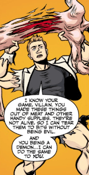 “I know your game, villain! You made these things out of meat and other handy supplies. They’re not alive, so I can tear them to bits without being evil! And you being a demon… I can do the same to you!”