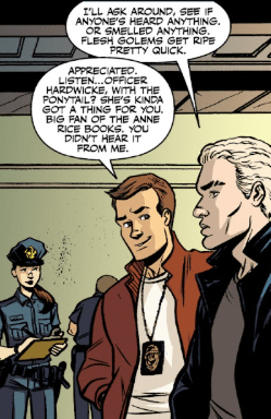 Spike doesn’t take his eyes off the scene, as Dowling turns to him. “I’ll ask around, ” the vampire says. “See if anyone’s heard anything or smelled anything.” He sniffs the air again and immediately regrets it. “Flesh golems get ripe pretty quick.”