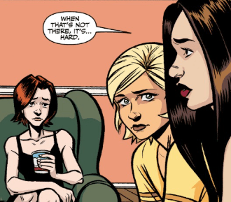 Buffy and Willow turn to her. Dawn grabs another scoop. “When you’re with someone like… that,” she says, slightly embarrassed. “You want to feel at ease. Relaxed. Like you can just be yourself. Be honest.” She moves the spoon to her mouth and then, before she eats, she says, quieter. “When that’s not there, it’s hard.” The spoon brings silence.