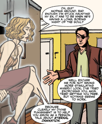 “Well excuse me for not having more stimulating misery!” he fires back. “Look, I’ve tried exorcising you, Anya. Tried setting you free. But nothing seems to work.”