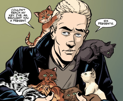 Xander shakes his head at her and then calls after Spike. “Wait a minute! I don’t know nothing about keeping no kitties!”