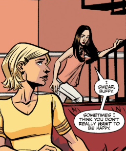 She gets off the couch angrily, moving towards the stairs. “I swear, Buffy,” she says as she starts to climb. “Sometimes I think you don’t want to be happy.” Then, Dawn is gone and Buffy sits in silence. She turns to Willow, who has removed the spoon now, and has picked Dawn’s ice-cream up. She then settles back into her chair and looks at Buffy.