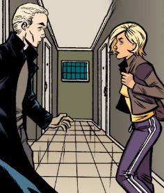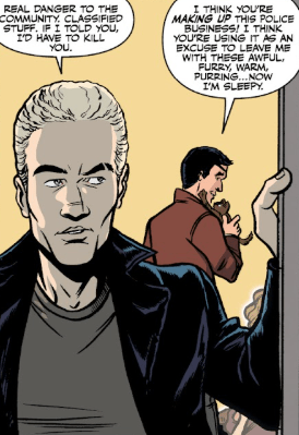 He babbles about using his fingernails as claws, but Dowling stops him. “I’m all set, thanks.” As Spike waves his hands and begins to walk away, the detective calls after him. “Listen, Spike… I’m glad to to have you working with us so often. Believe me. And you know I adore Buffy… But you’ve got to give other women a chance, on their own terms. Get back out there. Don’t compare everyone you met to…”