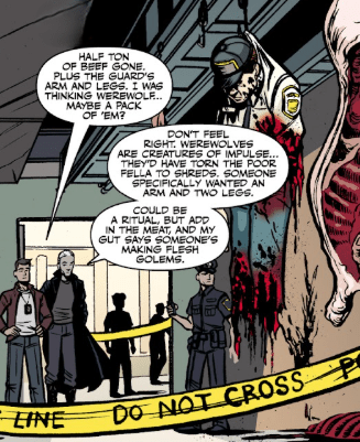 “Don’t feel right,” he says, sniffing the air. “Werewolves are creatures of impulse. They’d have torn the poor fella to shreds. Someone specifically wanted an arm and two legs. Could be a ritual, but, add in the meat and my gut says someone’s making flesh golems.”