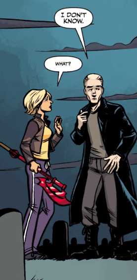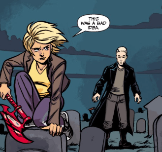 His tone is quick, but harsh. Buffy doesn’t say much else. She stares at him, hurt and then, turning, agrees. “No. You’re right. This was a bad idea.” Then, she’s gone, flipping over a wall and leaving Spike standing in the middle of the cemetery, alone and confused.