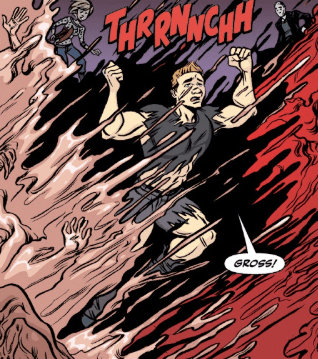 And then, with a triumphant cry and shouting the word “GROSS!” loudly, Andrew rips himself free from the creature, the flesh sprawling, blood everywhere.
