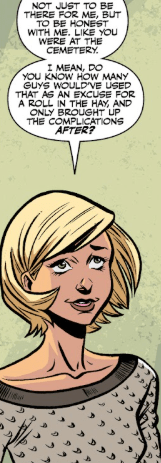 “Not just to be there for me, but to be honest with me. Like you were at the cemetery,” she says, moving her hair behind her ear as she does. “I mean, do you know how many guys would’ve used that as an excuse for a roll in the hay, and only brought up the complications after?”