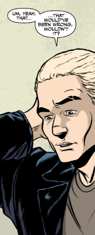 Spike stares at her in silence for a moment. “Pretty speech, Slayer. Every word you said is right and true. Just one problem.” He turns for a moment and then copies her movements, looking her in the eyes and ensuring contact. “I’m in love with you.”
