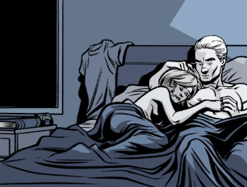 Across the hall, Buffy sleeps, exhausted, in Spike’s arms. He’s not asleep, but he’s staring at her, in love. But at the same time, he’s annoyed with himself.