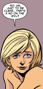 Buffy sits up, wraps the bed sheet around herself and, with a smirk, asks him: “So… you evil?”