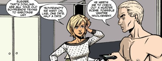But then, Spike’s cell phone starts ringing, annoying them both. Spike takes a look at the caller ID and sighs in annoyance. “Bugger! That’s Dowling. Are all your old boyfriends trying to sabotage us?”