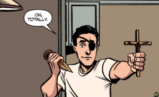 And Xander stands there, in front of his friend, with a stake in one hand and a crucifix in the other. “Oh, totally.”