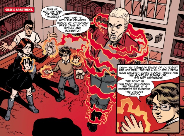 Giles sighs and turns back at Xander, detriment on his young voice. “One: the Crimson Bands of Cytorrak are not real. They’re a silly spell from your childish comic books. These are the Scarlet Bonds of… Never mind. It’s not important. The point is you must recognise the danger. It is imperative we exercise the utmost caution.”