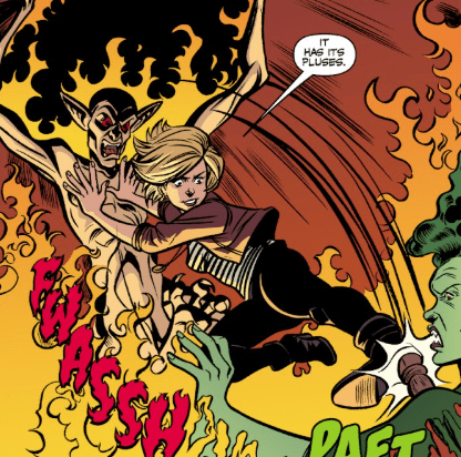 Xander moves to aid her, his own stake in his hand, but then he stops. “Wait. Do you smell something burning?” He turns and sees the store is ablaze, a huge fire encroaching on them, clearly set deliberately. He turns to Buffy, still battling. “This is inconvenient.”