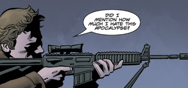 Zone, Griff and Mag are holed up in a hardware store. A Wielder appears outside – not a Butcher, but still dangerous. Zone shoots through the window, startling the newcomers. They choose to stay, fearing what’s out there more. Mag notices the Hollywood Hills transmitter flashing red.