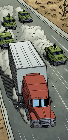 A bazooka is fired. Trevor swerves, avoids the blast, and scatters equipment across the road. The truck halts. Ivy 2 appears with a Wielder device. Ivy 3 knocks her out before it activates. Alpha stares blankly, clearly affected.