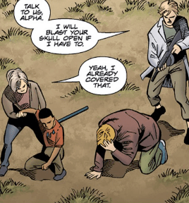 Ivy 3 checks if he’s been imprinted. Alpha resists, claiming his internal personalities are holding strong. As they exit the truck, Alpha falters. The Ivies raise their weapons. Trevor intervenes, refusing to let them kill Alpha.