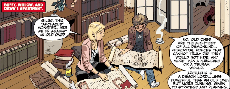 Sat on the wooden floor in her apartment, surrounded by old papers and musty books, Buffy Summers sighs as she puts down a parchment scroll. She turns to the twelve-year-old boy at her side, flustered. “Giles. This ‘Archaeus’ monster… Are we up against an Old One?”