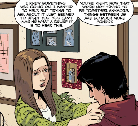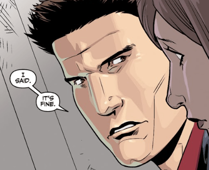 Angel rolls his eyes. “It doesn’t matter,” he says, grimly. “We’ve got more important things to worry about.” Buffy tries to stop him as he goes to leave the room, but he turns back to her, his eyes cold. “I said: it’s fine.”