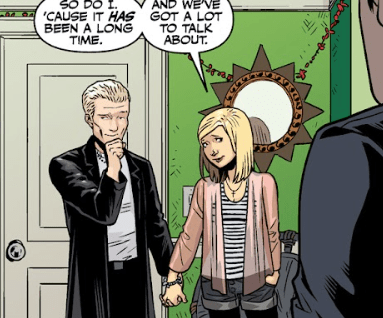 Buffy mentions fighting and killing Angel, which she did in Season 2. This is the first time they have seen each other since Season 8.