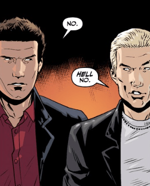 Angel and Spike, agreeing for the first time since he walked in, both say no at the same time.