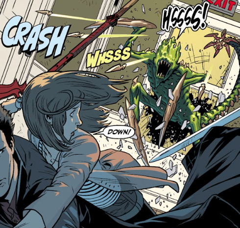 It slices Willow across her arm and she screams, falling backwards against the wall as the demon skitters up onto the ceiling, hissing. Giles notices the wound — Willow has been poisoned. He’ll need time to summon an antidote.