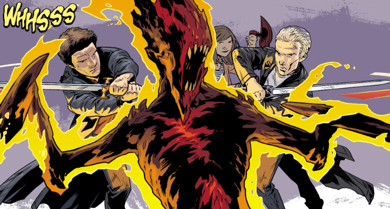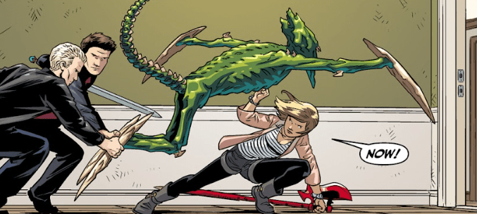 The trio move as one, Buffy trapping the demon by its tail, impaling it to the floor with the Scythe. In tandem, Angel and Spike swing their swords towards the demon’s neck.