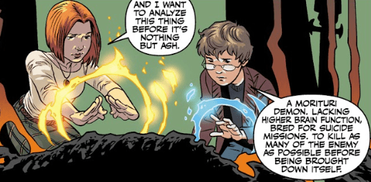 Willow, walking into the room, still leaning on Giles, tells them they’re going to have plenty of practice. The antivenom Giles cooked up is slowly working and the witch wants to analyse the demon’s body before it burns completely. Giles identifies it as a Morituri demon — bred for suicide missions.