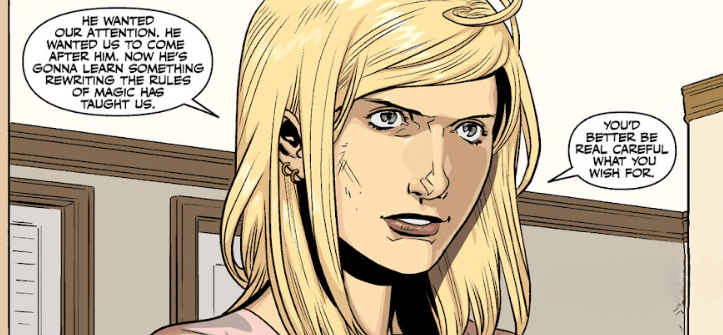 Buffy turns and addresses the room. “He wanted our attention. He wanted us to come after him. Now he’s gonna learn something that rewriting the rules of magic has taught us…”