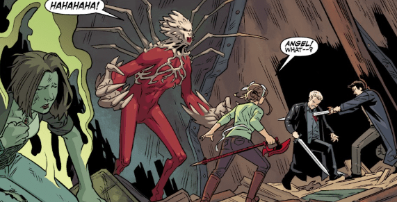 Then Spike sees red. He knows no reason now. Just rage. Buffy yells at him to stop as Angelus growls, their swords clashing and their blows parrying deeper into the abandoned vessel. As she races towards them both, Archaeus stops her with one of his spiked appendages coming from his spine. “DON’T SPOIL IT,” he taunts. “YOU THOUGHT I WAS HIDING FROM YOU? I WAS GIVING YOU TIME TO LET YOUR HATES AND FEARS AND JEALOUSIES FESTER.“