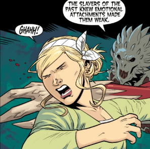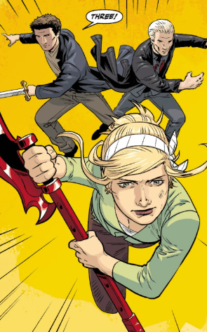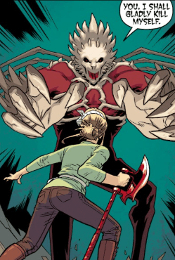 Archaeus is stunned. How dare they think they can stand against him? They can barely stop from murdering each other! He grabs Buffy in his claws, but she smashes the Scythe into his torso. “Y’know what happens when you fight all the time?” she asks the demon.