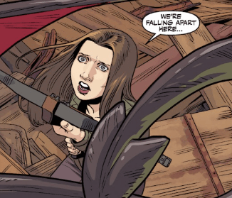 As Archaeus snarls at her and pounces, Buffy only just manages to move Willow out of his way in time. She realises how injured Willow is, but her friend tells her she can still fight. “You and me. Together.” But Willow doesn’t look confident. As she throws up a force field to protect her and Buffy from another blow, she tells the Slayer that while they’re tough together, they’re not enough this day.