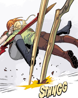 By the time he looks up again, Angel is back. He moves like a force of nature, as sudden as a breaking dam, launching himself at Archaeus and slashing him ferociously with his blade. “Never again!” he proclaims, Archaeus yelping as Willow hits him from the other direction.
