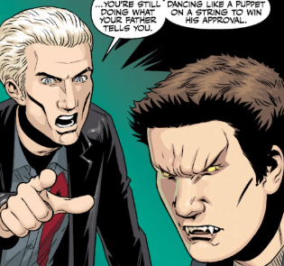 Spike struggles to hold Angelus back, realising that all he really knows is Catholic guilt and daddy issues, which suddenly gives him an idea.