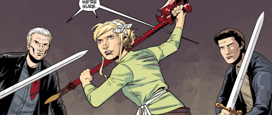 As Archaeus’ cackle echoes in her ears, Buffy hesitates for a moment as she looks at Spike, impaled on Angel‘s sword. Or is it Angelus? She hasn’t time to figure it out. “Angel! What are…”