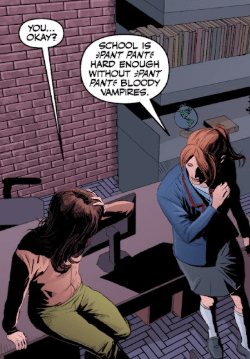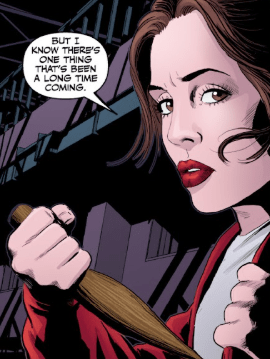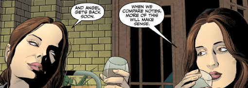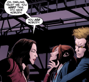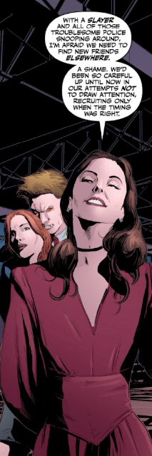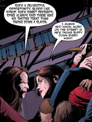 But Drusilla doesn’t flinch. Her followers rush to defend her, willing to fall. She smiles wickedly. “Your actions are children’s lies you tell yourself in little singsongs. A make-believe hero with little wind-up springs. Such a delightful opportunity. Blood like syrup. Such sweet desserts.” She sways forward, a macabre dance. “Spike always said there was no tastier treat than taking down a Slayer.”