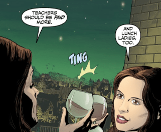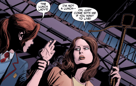She asks Fred about Illyria. Fred admits the adrenaline stirred something when Shane grabbed her. Illyria stirred — but she kept it in check. She doesn’t think they need to worry yet. But it needs resolving. Faith nods. “One thing I definitely learnt about school: teachers should be paid more.” Fred chuckles. “Lunch ladies too.”
