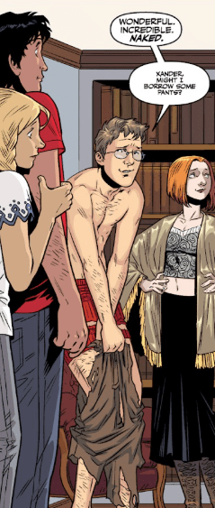 Two hours later, bright green flames spark around Rupert Giles. Xander and Buffy stand back, slightly concerned despite Willow’s assurances. Giles, standing in a pentagram on the floor, doesn’t feel any different and begins to say so — when his clothes rip into shreds around him.