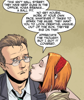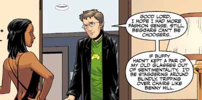 He greets the Scoobies in their apartment, dressed almost like he used to, smiling. Willow is getting ready for her final interview with Theo Daniels, so she’s off. Giles tactfully suggests her attire might not be right for the job. Willow’s surprised, kisses him on the cheek. It’s not a business-like job. Modern office. No pressure. Think think tank with creative aides. She appreciates the thought, but she’s cool.