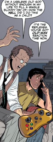 Xander looks at the annoyed young man out of the corner of his eye. “It’s the reflexes. You have old man reflexes now.” Giles’s anger has made him lose the game. That and slamming the controller down.