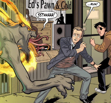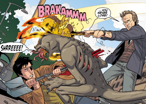 Giles scans the street, grins, and picks up a trash can. He hurls it into the nearest pawn shop window. “Some skills you never lose,” he mutters, grabbing a guitar from the storefront and smashing it hard across the hellhound’s head as Xander pierces the hound with the pole. The creature drops instantly.