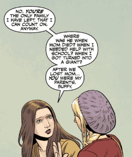 Dawn stops. She sits Buffy down and tells her that she is the only family she’s got. “Where was he when mom died? When I needed help with school? When I got turned into a giant? After we lost mom… you were my parents, Buffy.”