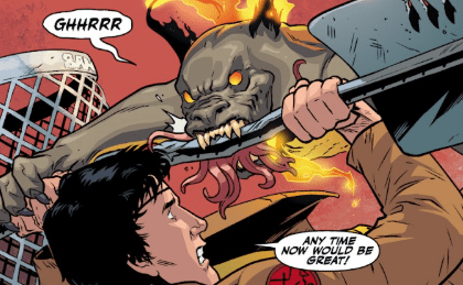 Xander warns him they need something — anything — as the hellhound pounces. A metal pipe is the only thing standing between Xander and the creature’s jagged teeth, its horns aflame.